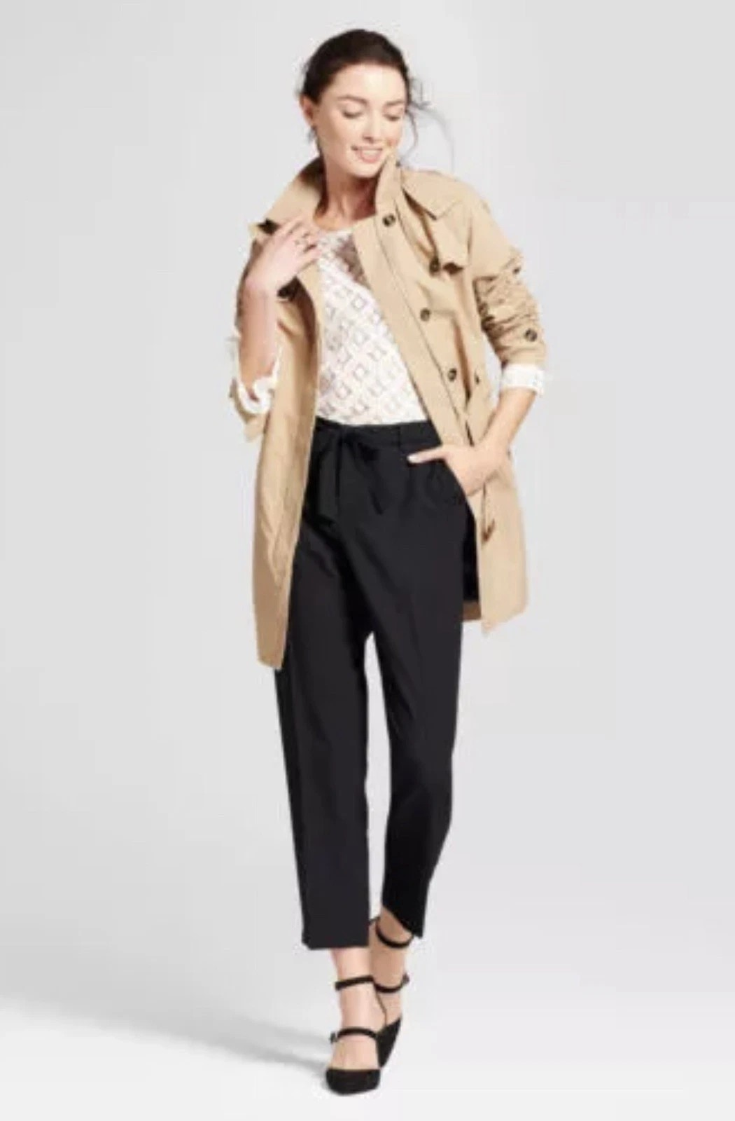 Waist: Elastic back waistband with belt loops and fabric tie belt
